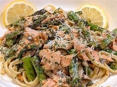 Salmon and asparagus in a rich dill infused creamy sauce served tossed through pasta