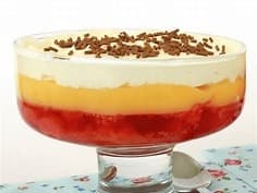 Peaches set in a mango jelly topped with marsala infused sponge, custard, freshly whipped Chantilly cream and dusted with chocolate. What a trifle of desserts!
