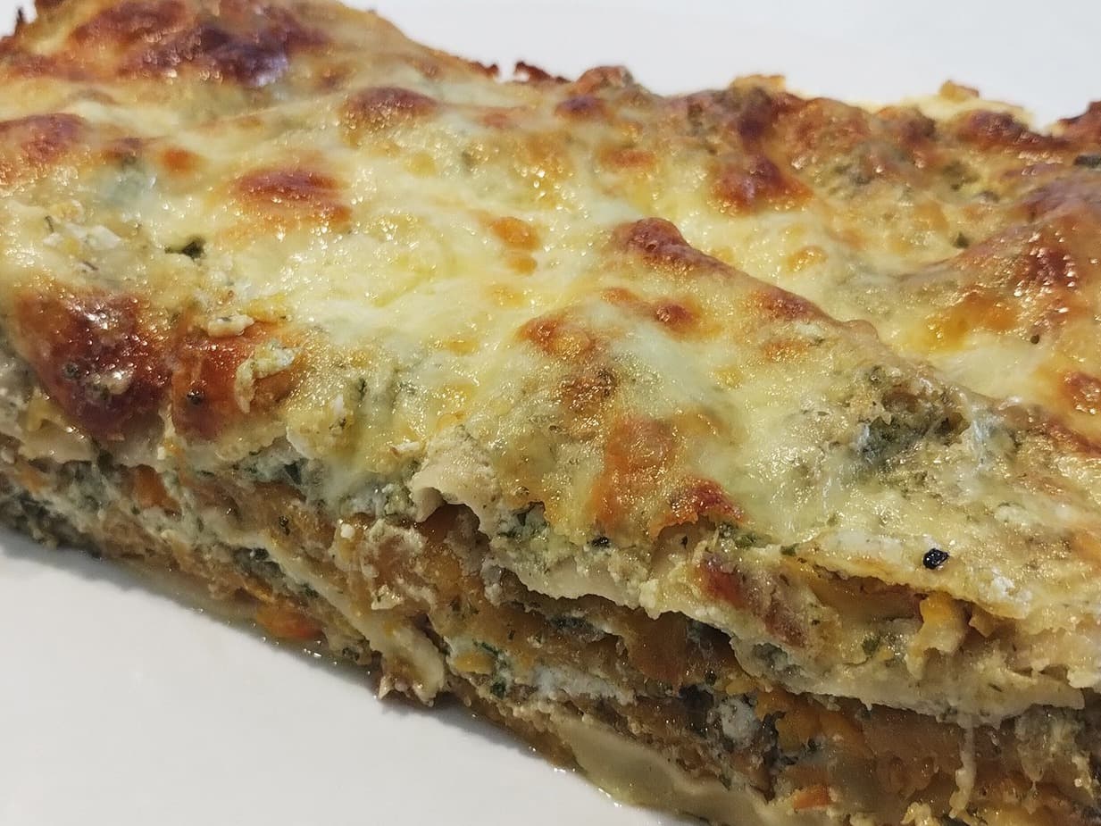 Comfort food at it's best. We roast sliced butternut pumpkin and layer it with lasagne sheets and a creamy mixture of ricotta, cheddar, mozzarella and blue cheese plus our delicious sage, rocket and walnut pesto.
