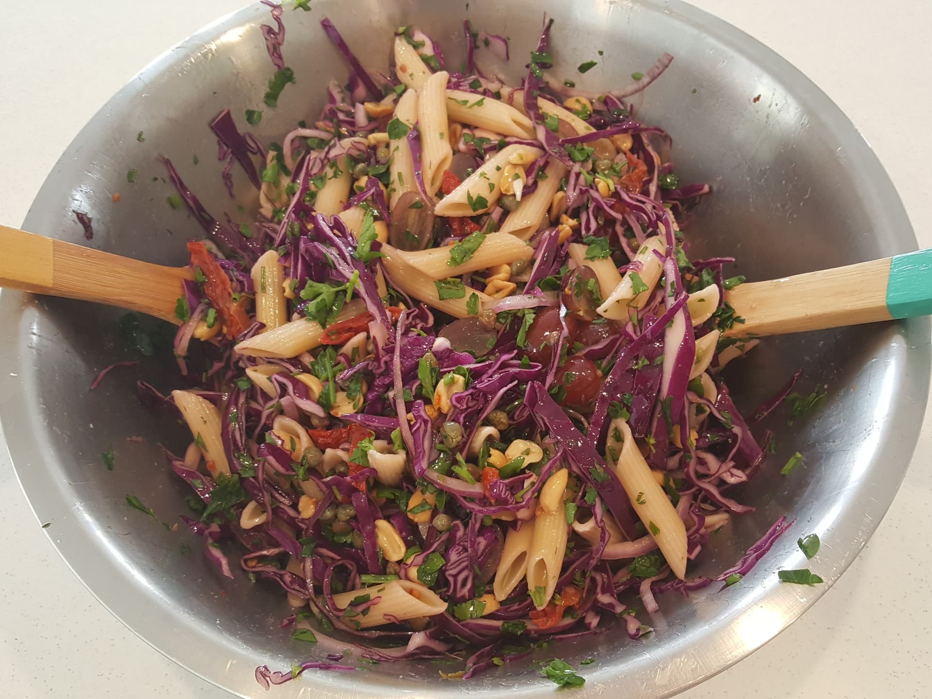 Penne with sun-dried tomatoes, grapes, capers, parsley and a lemon and extra virgin olive oil dressing (also contains nuts).