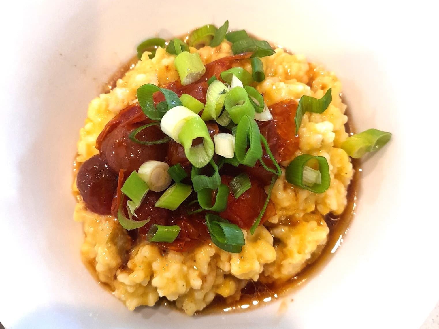Traditional creamy risotto with cheddar cheese - topped with baked balsamic cherry tomatoes and spring onions.