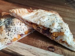 Pumpkin, Puff pastry (Wheat), Caramelised Red Onions [Red onion, Balsamic vinegar (Sulphites), Extra virgin olive oil, Brown sugar, Salt], Feta (Milk), Walnuts, Poppy seeds, Extra virgin olive oil, Garlic, Salt, Black pepper