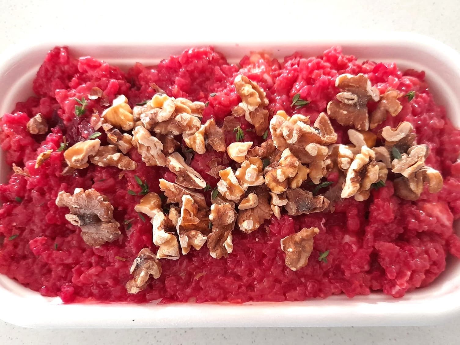 Creamy traditional risotto with local beetroot, toasted walnuts, vegan feta cheese and thyme - yum!