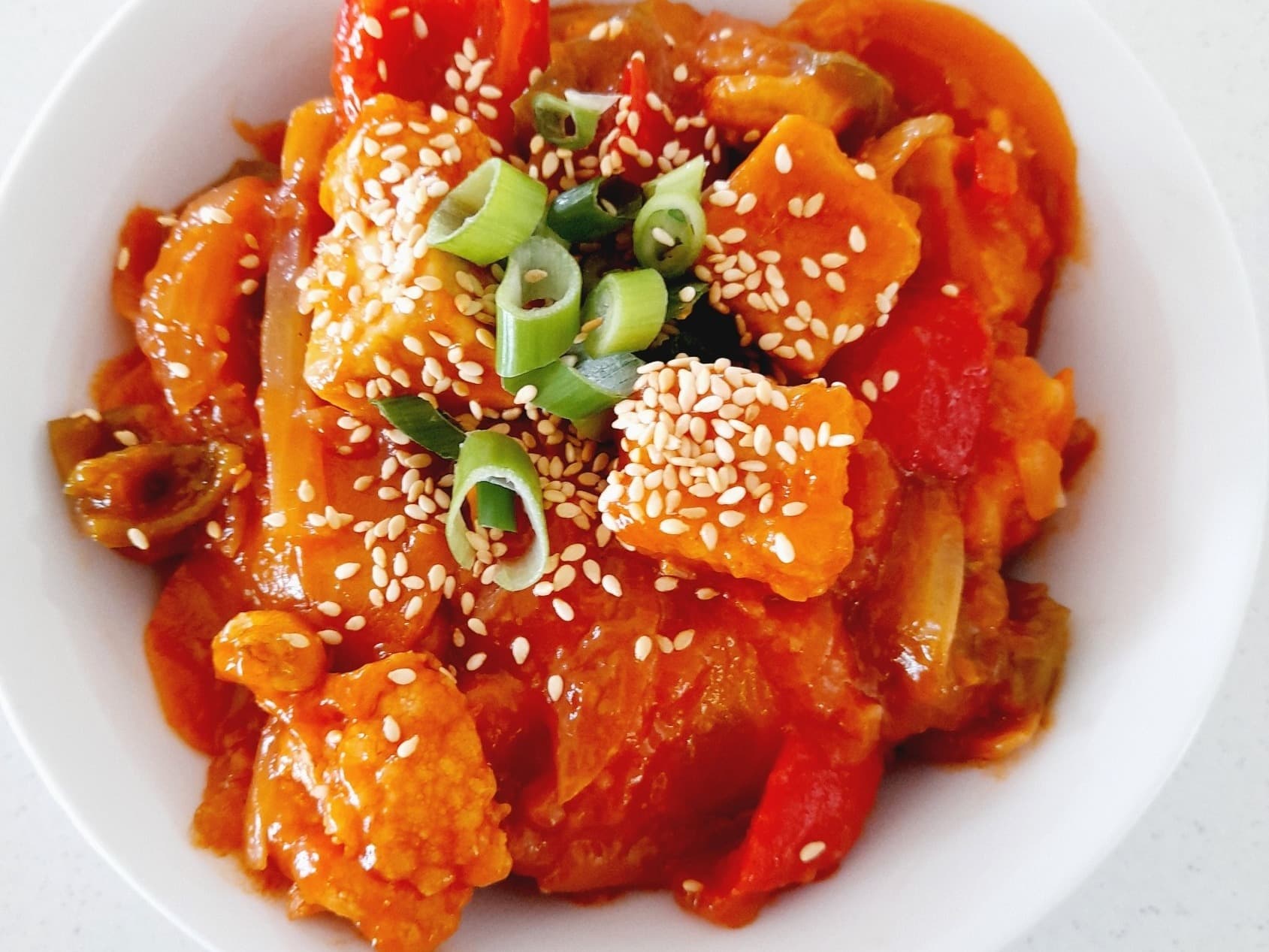 Our healthier version of this dish with tofu, cauliflower, capsicum, carrot and cashews topped with spring onion and sesame seeds. We can leave out the nuts and seeds if you are allergic. Just let us know.