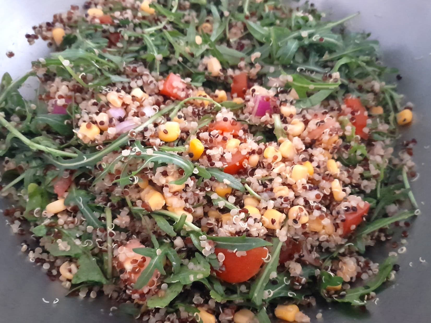Tri-coloured quinoa and corn tossed with fresh tomato, crisp cucumber, peppery rocket, and diced Spanish onion, all brought to life with a spicy lime dressing.