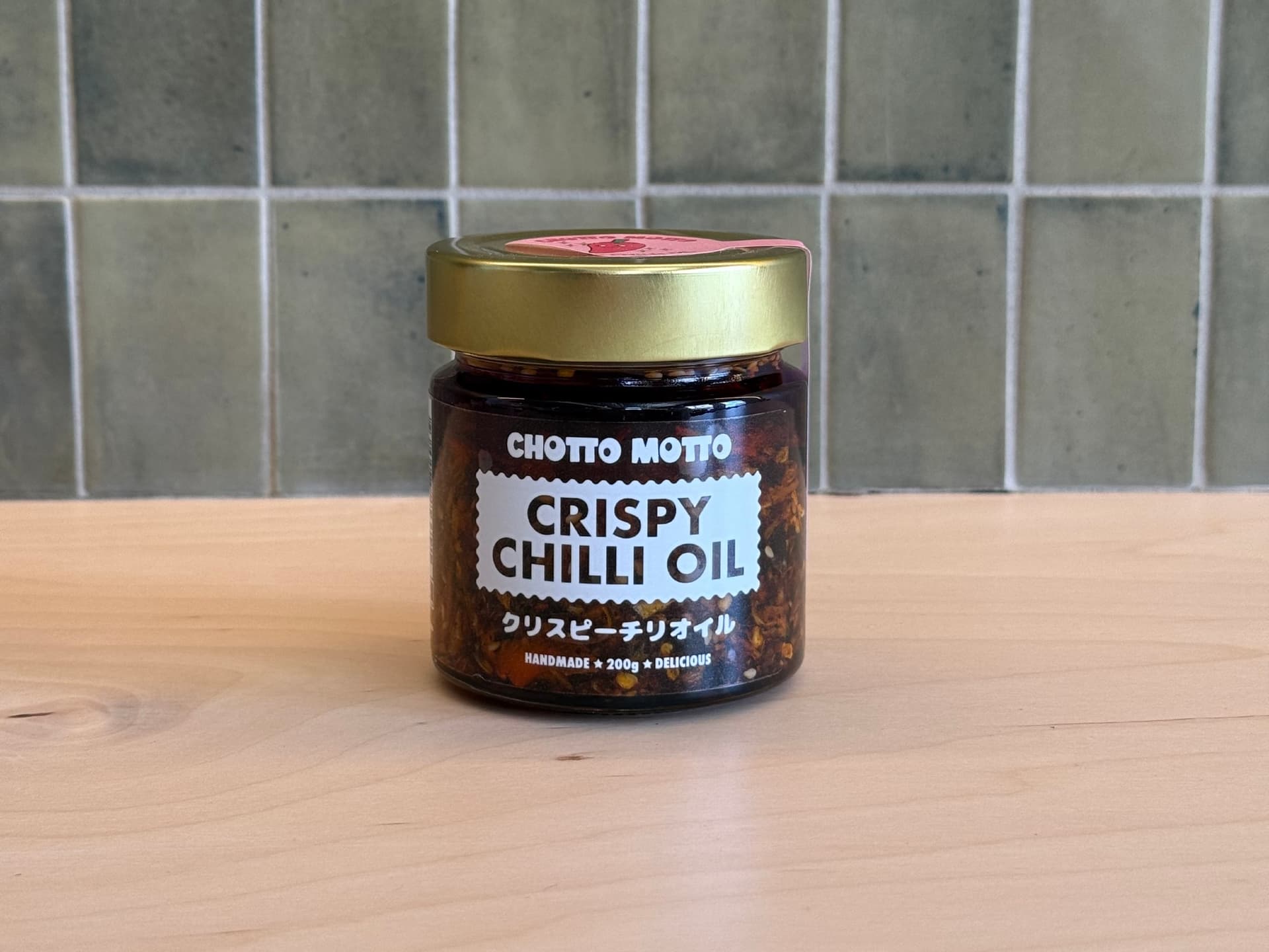 If you haven't tried this, make today be the day! Chotto Motto Crispy chilli oil is the perfect accompaniment to breakfast eggs, noodles, pizza, or even vanilla ice cream. Chili, crunchy garlic, shallots and more are cooked down in a blend of sesame and vegetable oil to develop a rich flavour.