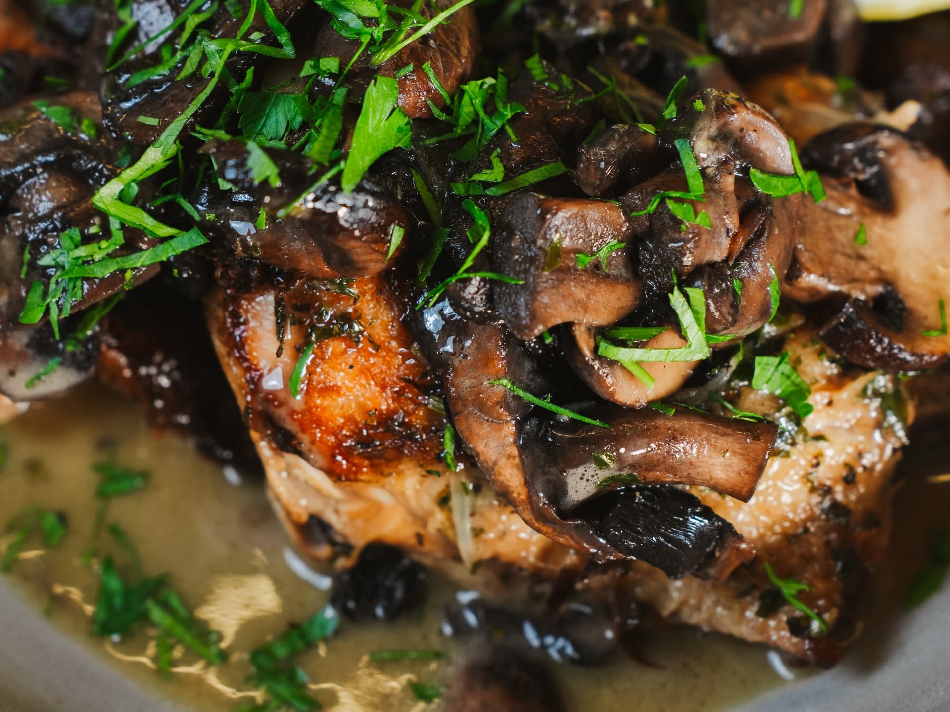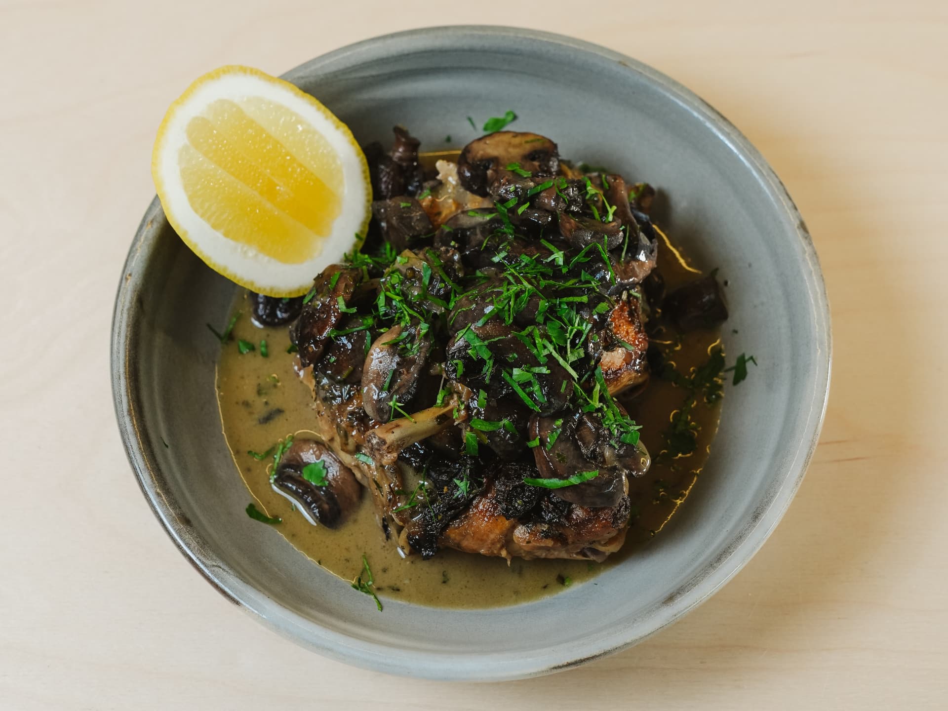 Chicken Marylands slow-cooked with white wine and mushrooms finished with crème fraiche lemon zest and soft herbs. Rich, luxurious and deeply satisfying.