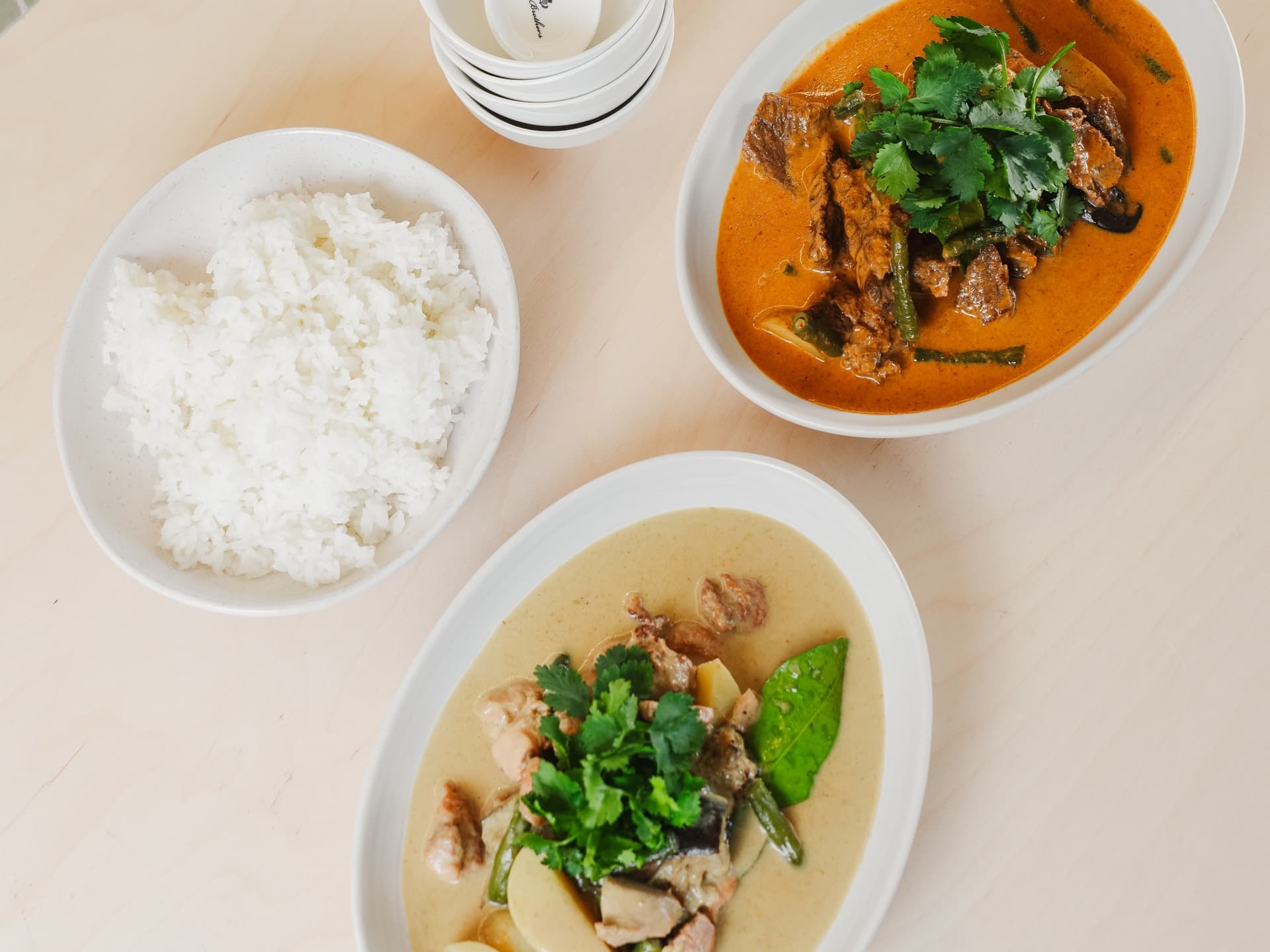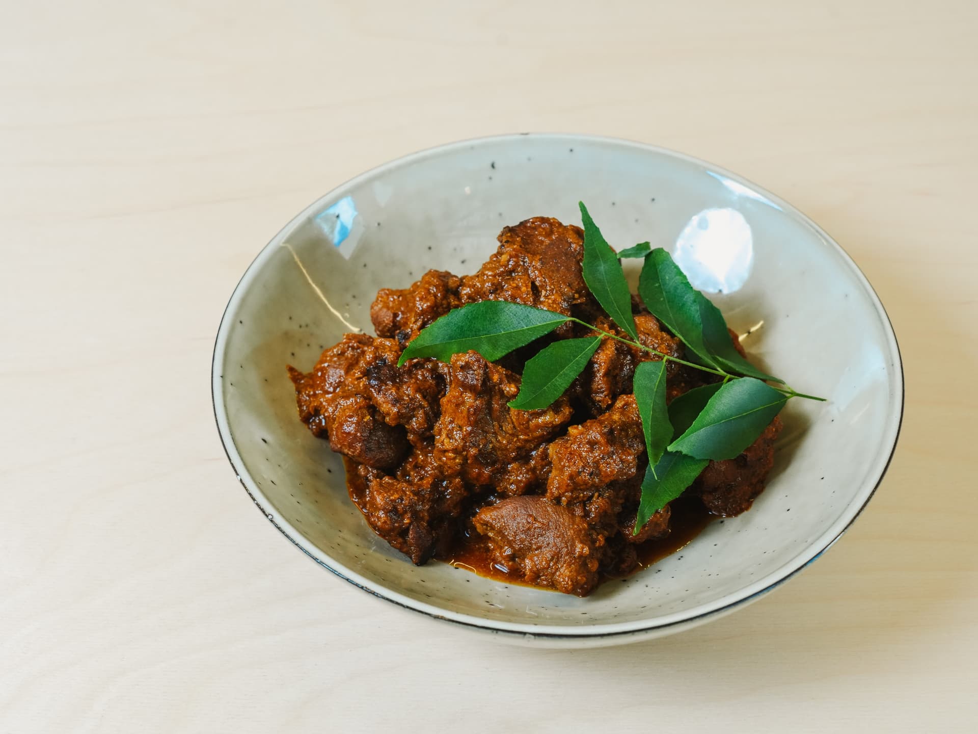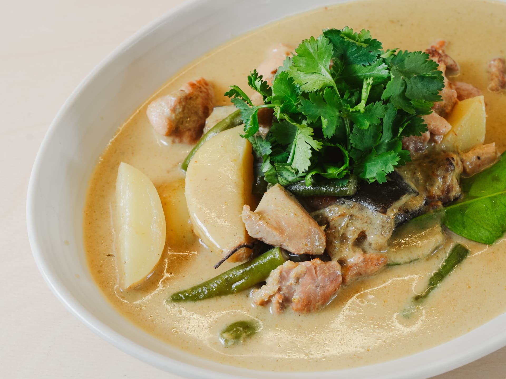 Beef braised in coconut milk with red curry paste and lemongrass, finished with lime leaf and snake beans. Rich and warming.