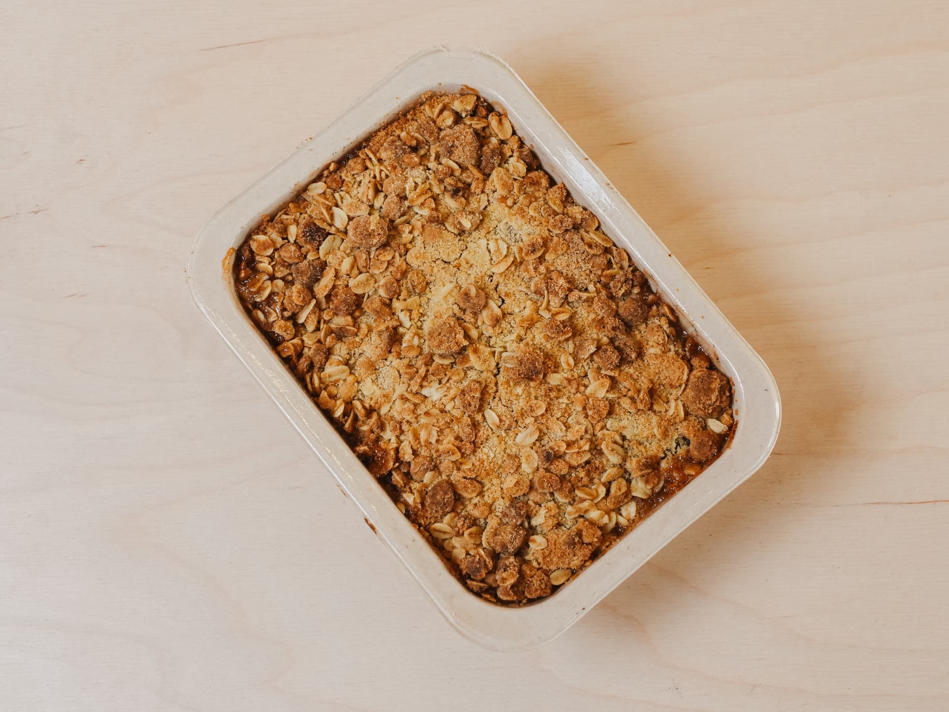 Apples baked beneath a buttery, golden crumble topping. Sweet, slightly tart, and utterly comforting.