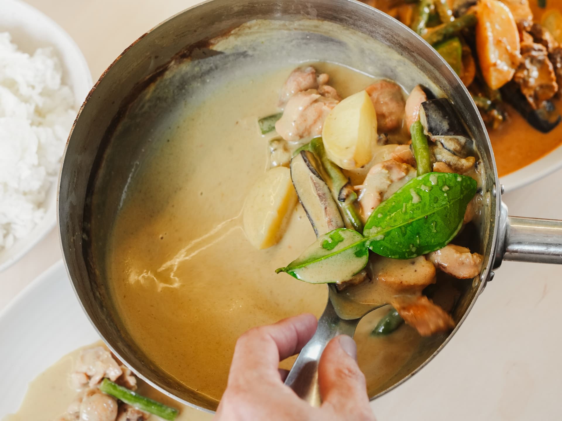 Chicken simmered in coconut milk with chilli and lemongrass, finished with lime leaf and snake beans. Zesty and fragrant.