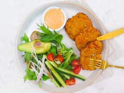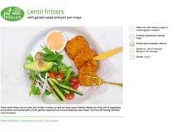 These lentil fritters are so tasty and simple to make, as well as being super healthy! Baked not fried, full of vegetables and protein and served with a fresh garden salad and our housemade peri peri mayo. You'll be left feeling satisfied and nourished. Spiciness mild. Cooking equipment: baking trays; pantry items needed: olive oil; Hands-on time 20-25 mins, ready in: 45 minutes; Make this dish within 5 days of receiving your meal kit.
