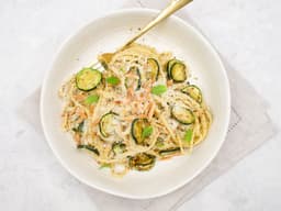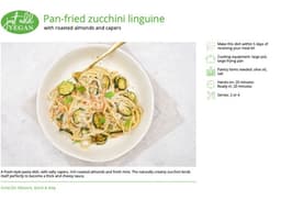 Pasta linguine (Wheat), Zucchini, Roasted slivered almonds [Almond, slivered], Lemon juice, Capers, Vegan parmesan, Olive oil (pantry item), Garlic, Mint, Nutritional yeast, Salt (pantry item), Lemon zest