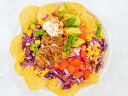 Jackfruit in brine, Corn chips, Tomato, Brown onion, Red cabbage, Avocado, Water (pantry item), Smokey BBQ sauce, Vegan sour cream, Lime juice, Nacho seasoning for jackfruit nachos [Cumin ground, Garlic powder, Paprika ground, Chilli powder (hot)], Coriander ground