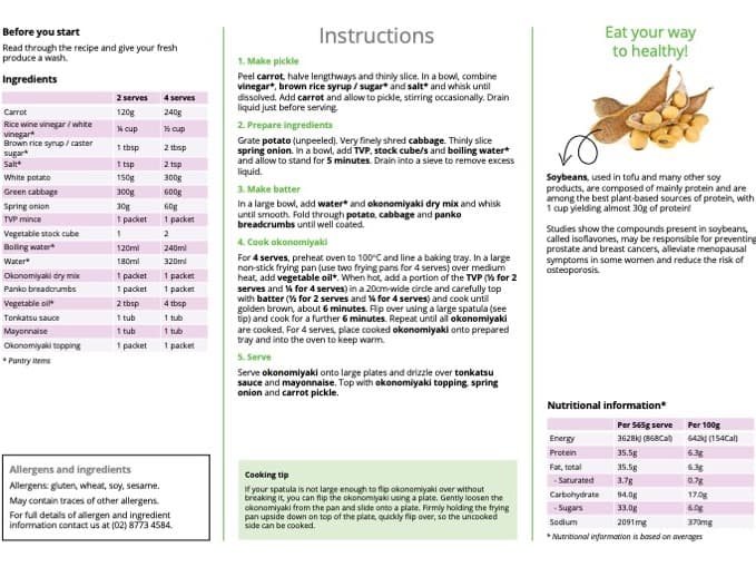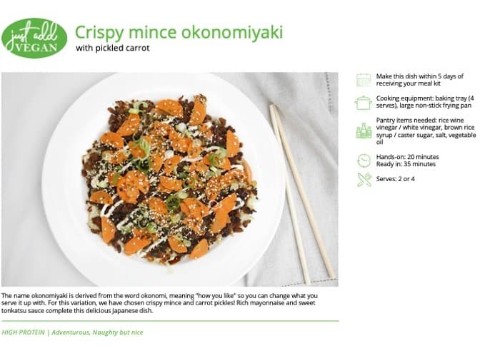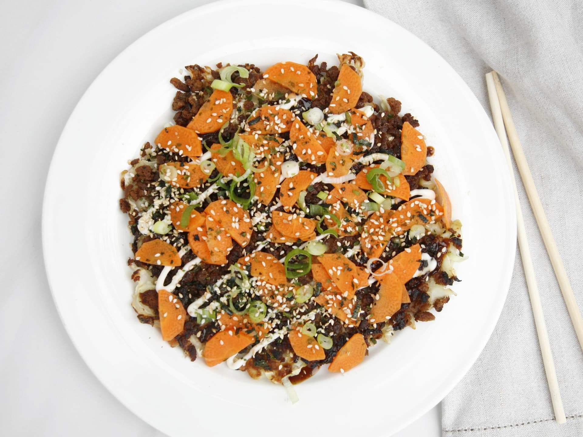 The name okonomiyaki is derived from the word okonomi, meaning 'how you like' so you can change what you serve it up with. For this variation, we have chosen crispy mince and carrot pickles! Rich mayonnaise and sweet tonkatsu sauce complete this delicious Japanese dish. Pantry items needed: rice wine / white vinegar, caster sugar, salt, vegetable oil; Hands-on: 20 minutes, ready in: 35 mins; Cooking equipment: baking tray (4 serves), large non-stick frying pan; Use within 5 days of receiving your meal kit.