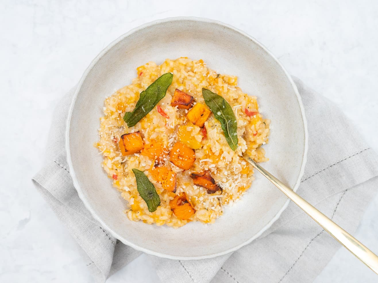 A simple and satisfying risotto with creamy pumpkin, warming sage and a hint of chilli. Perfect for cozying up with on the colder nights. Pantry items needed: olive oil, plant-based butter, salt, freshly ground black pepper; Hands-on: 20-25 mins, Ready in: 25-30 mins; Cooking equipment: baking tray, medium/large pot; Make this dish within 5 days of receiving your meal kit.