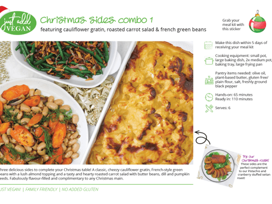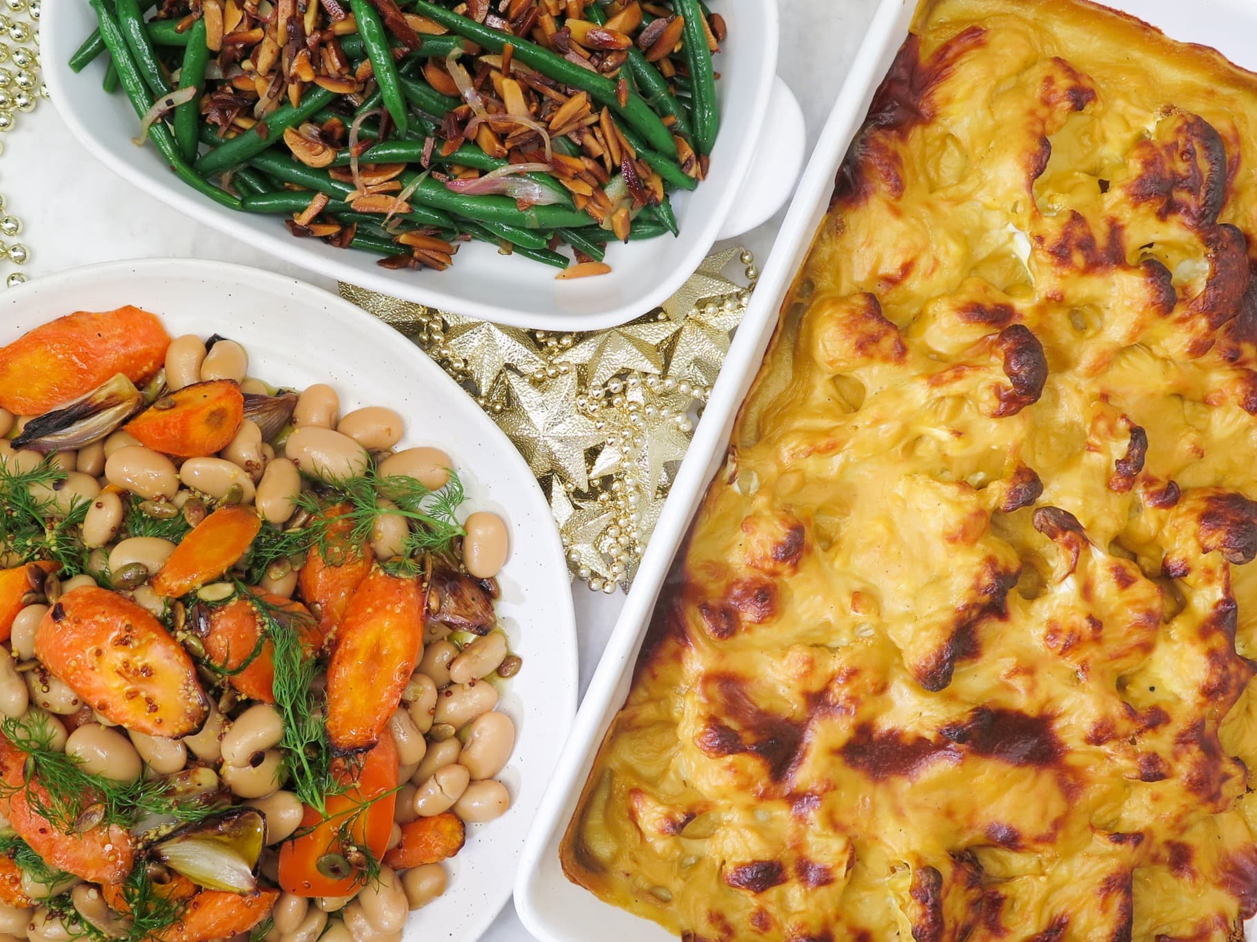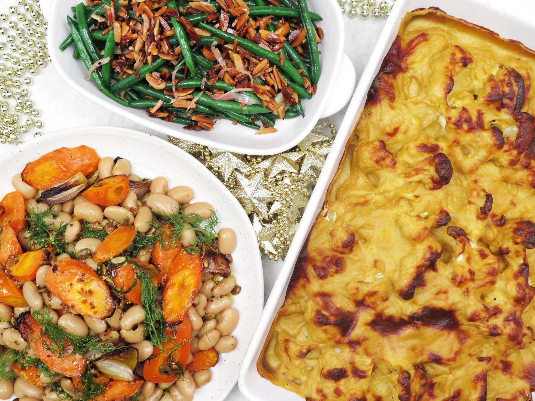 Three delicious sides to complete your Christmas table! A classic, cheezy cauliflower gratin, French-style green beans with a lush almond topping and a hearty roasted carrot salad with butter beans, dill and pumpkin seeds. Pantry items needed: olive oil, plant-based butter, gluten free / plain flour, salt, freshly ground black pepper; Hands-on: 65 mins; Ready in: 110 mins.