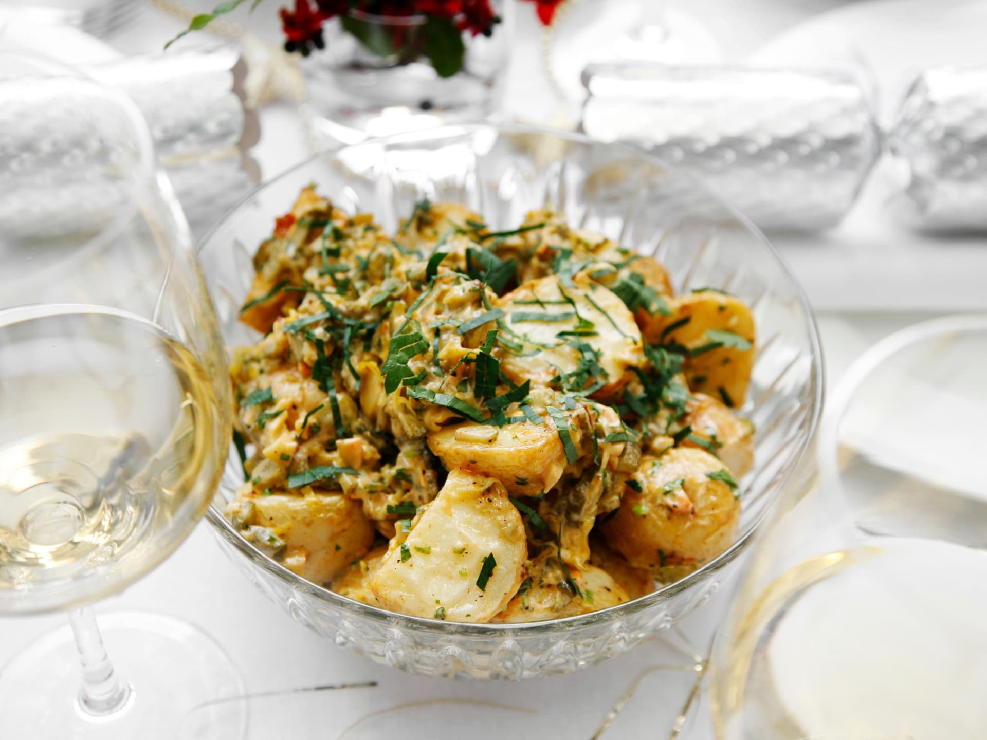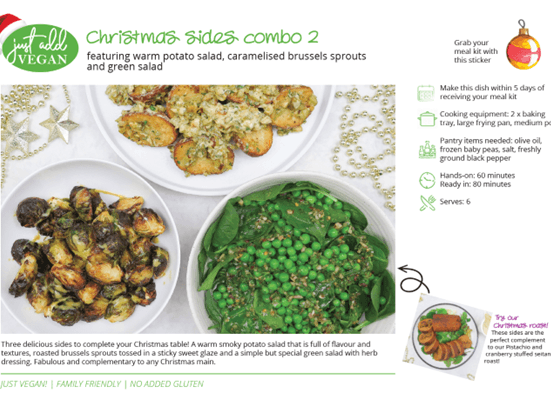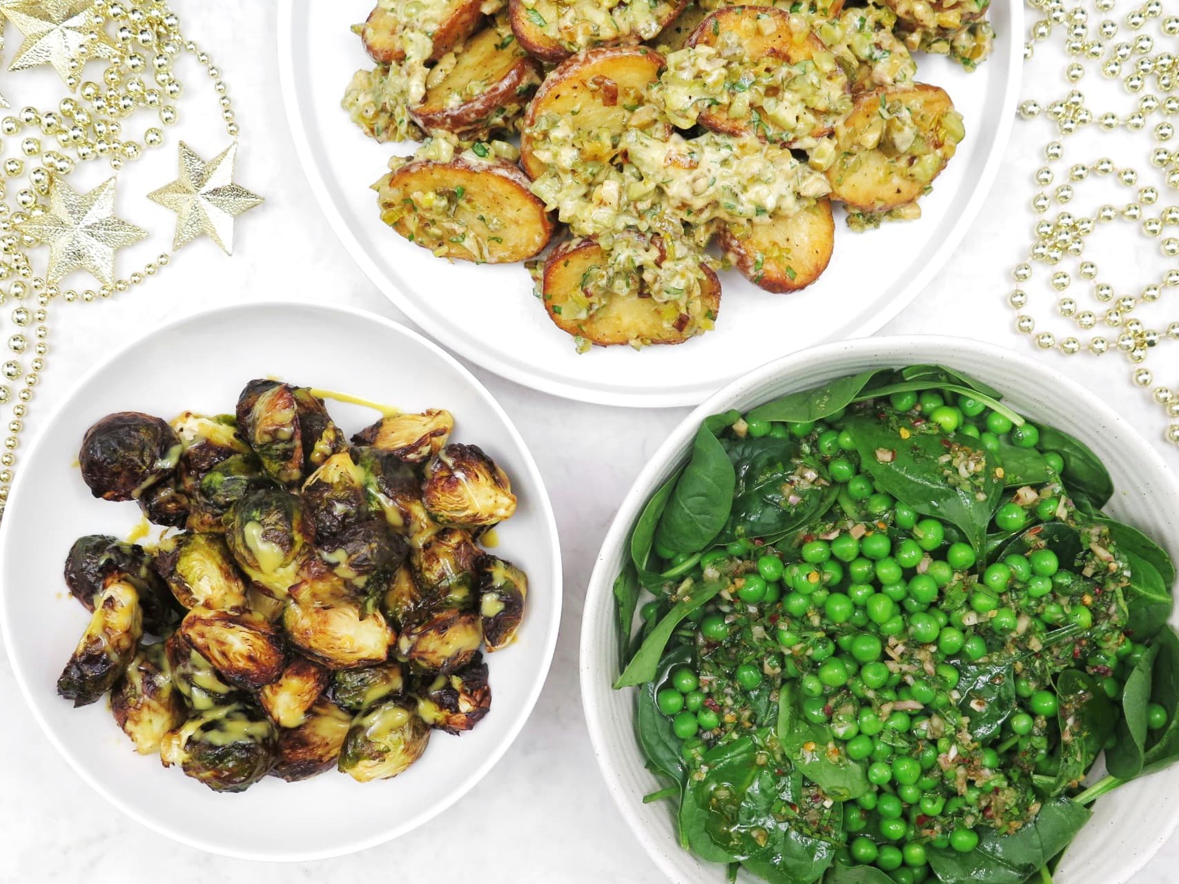 Three delicious sides to complete your Christmas table! A warm smoky potato salad that is full of flavour and textures, roasted brussels sprouts tossed in a sticky sweet glaze and a festive green salad with herb dressing. Pantry items needed: olive oil, frozen baby peas, salt, freshly ground black pepper. Hands-on: 65 mins; Ready in: 110 mins.