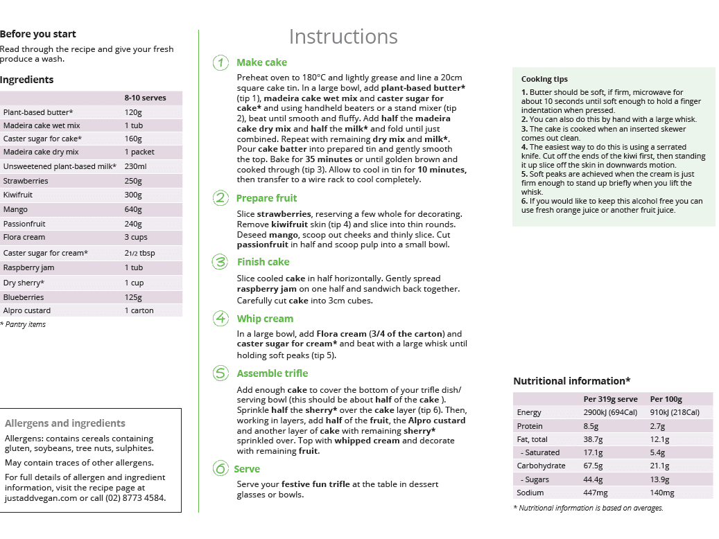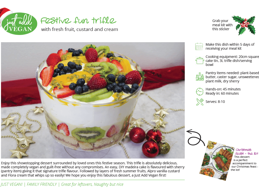 Enjoy this showstopping dessert surrounded by loved ones this festive season. This trifle is absolutely delicious, made completely vegan and guilt-free without any compromises and can comfortably feed 8-10 people around your festive table. An easy, DIY no-added gluten madeira cake is flavoured with sherry (pantry item) giving it that signature trifle flavour. Followed by layers of fresh summer fruits, Alpro vanilla custard and Flora cream that whips up so easily! We hope you enjoy this fabulous dessert, a Just Add Vegan first! Pantry items needed: plant based butter, caster sugar, unsweetened plant based milk, dry sherry; Hands-on: 45 mins; Ready in: 60 mins; Cooking equipment: 20cm square cake tin, 3L trifle dish/serving bowl; Use within 5 days of receiving your meal kit.