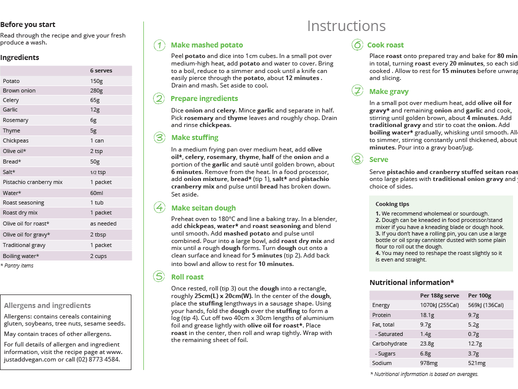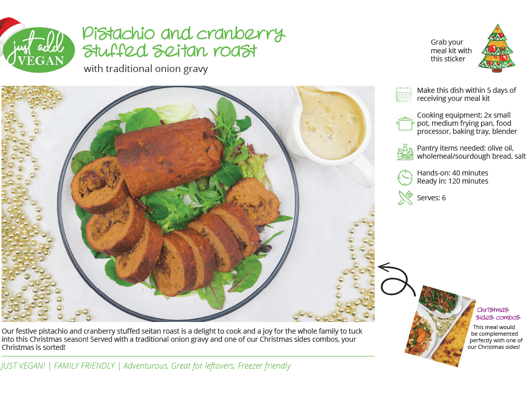 Our festive pistachio and cranberry stuffed seitan roast is a delight to cook and a joy for the whole family to tuck into this Christmas season! Served up with rich gravy and one of our Christmas sides combos, your Christmas is sorted! (and made double the size of the previous time we did our Christmas menu!) Pantry items needed: olive oil, bread, salt; Hands-on: 40 mins, Ready in: 120 mins; Cooking equipment: 2x small pot, medium frying pan, food processor, baking tray, blender; Use within 5 days of receiving your meal kit.