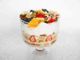 Plant based cream (Flora), Custard (Soy), Madeira cake dry mix [Plain flour (Wheat), Almond meal, Baking powder, Salt], Mango, Dry sherry, Plant-based milk (pantry item), Strawberries, Kiwifruit, Caster sugar (pantry item), Blueberries, Plant-based butter (pantry item), Passionfruit, Strawberry jam, Madeira cake wet mix [Maple syrup, Vanilla extract]
