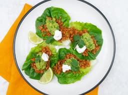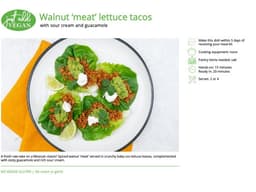 A fresh raw take on a Mexican classic! Spiced walnut 'meat' served in crunchy baby cos lettuce leaves, complemented with zesty guacamole and rich sour cream. Spiciness mild. Pantry items needed: salt; Hands-on: 15 mins; Ready in: 20 mins; Cooking equipment: none; Use within 5 days of receiving your meal kit.