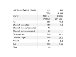 Sugar, Cocoa butter, Rice malt syrup, Slivered almonds, Rice flour, Asafoetida powder, Sunflower lecithin, Vanilla bean, Colour (101(i))