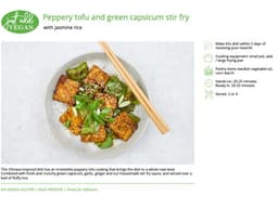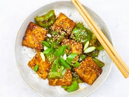 Tofu hi-protein firm (Soy), Water (pantry item), Green capsicum, Jasmine rice, Pepper stir-fry sauce [Tamari (Soy), Maple syrup, Gluten free kecap manis (Soy)], Vegetable oil, Tofu coating for peppery tofu [Cornstarch (GF), Freshly ground black pepper, Ground white pepper], Spring onion, Ginger, Cornstarch (pantry item), Toasted sesame seeds, Garlic