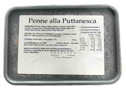 Pasta alla puttanesca is an Italian pasta dish invented in Naples in the mid-20th century. Its ingredients typically include tomatoes, extra virgin olive oil, olives, capers and garlic. Pasta variety is penne usually but may be different depending on batch. Artisanally made in Sydney. Use within 3 days. Only suitable for Wed/Thu delivery.