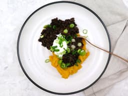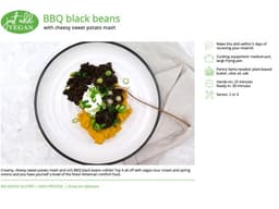 Creamy, cheesy sweet potato mash and rich BBQ black beans collide! Top it all off with sour cream and spring onions and you have yourself a bowl of the finest American comfort food. Pantry items needed: plant-based butter, olive oil, salt; Hands-on: 25 mins, Ready in: 30 mins; Cooking equipment: medium pot, large frying pan; Use within 5 days of receiving your meal kit.