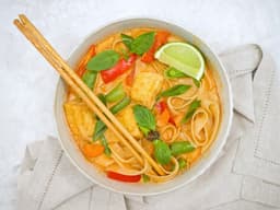 Water, Fresh fried tofu cubes (Soy), Rice noodles, Red capsicum, Carrot, Sugar snap peas, Lime juice, Spring onion, Red curry coconut soup base [Tamari (Soy), Vegetable oil, Brown sugar, Red curry paste], Ginger, Vegetable oil (pantry item), Coconut milk, Garlic, Vegetable stock cube, Thai basil