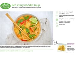 An easy, Thai-inspired red curry soup with with crunchy, fresh vegetables, flat rice noodles and handmade Nhu Quynh fresh fried tofu cubes. The perfect balance of fresh flavours, sweet, sour, and a little heat. Spiciness mild. Pantry items needed: vegetable oil; Hands-on: 15-20 mins, ready in: 20-25 mins; Cooking equipment: medium pot, large pot; Use within 3 days of receiving your meal kit.