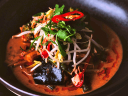 Coconut cream, Eggplant, Water, Tofu (Soy), Baby corn, Broccolini, Green beans, Penang curry paste [Lemongrass, Onion, Red chilli, Galangal, Ginger, Garlic, Vegetable oil, Palm sugar, Soy sauce (GF), Coriander ground, Cumin ground, Curry powder, Garam masala, Fenugreek seeds, Salt, Black pepper, Turmeric, Makrut lime leaves]