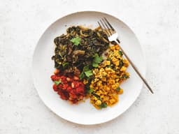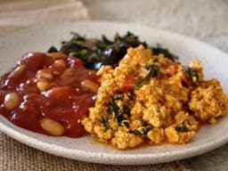 Start your day with this hearty breakfast, featuring moist and well-seasoned scrambled tofu, kale & mushroom saute, and in-house baked beans. Use within 5 days. Only suitable for Wed/Thu delivery.