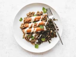 Mushroom sumac and hemp seed sausages on a bed of moujadara (a Middle Eastern dish made with green lentils, brown rice, onion and cumin) with kale and mushroom sauté topped with tahini Sauce. Use within 5 days. Only suitable for Wed/Thu delivery.
