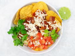 Tomato, Red kidney beans, Brown onion, Corn chips, Vegan mozarella cheese, White onion, Lime juice, Coriander, Vegetable oil (pantry item), Nachos spice [Salt, Cumin ground, Smoked paprika, Coriander ground, Freshly ground black pepper, Dried oregano, Cloves ground, Allspice], Garlic, Salt, Freshly ground black pepper