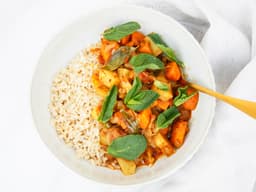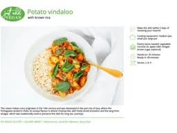 Water (pantry item), Potatoes, Tomato, Sweet potato, Basmati rice, Brown onion, Vegetable oil, Apple cider vinegar / white vinegar (pantry item), Ginger, Green chilli, Garlic, Mint, Brown sugar (pantry item), Salt (pantry item), Vindaloo seed mix [Black mustard seeds, Fenugreek seeds], Curry leaf