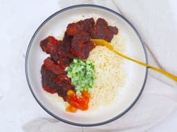 Plant-based protein (Forever) (Soy), Water, Coconut cream, Basmati rice, Cucumber, Mango chutney, Tandoori spice mix [Tapioca flour, Paprika ground, Salt iodised, Coriander ground, Turmeric, Caster sugar, Garam masala, Cumin ground, Ginger ground, Kashmiri chilli powder, Garlic powder, Ground black pepper], Lemon, Mint, Coriander, Agave syrup (pantry item)