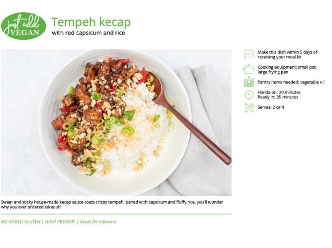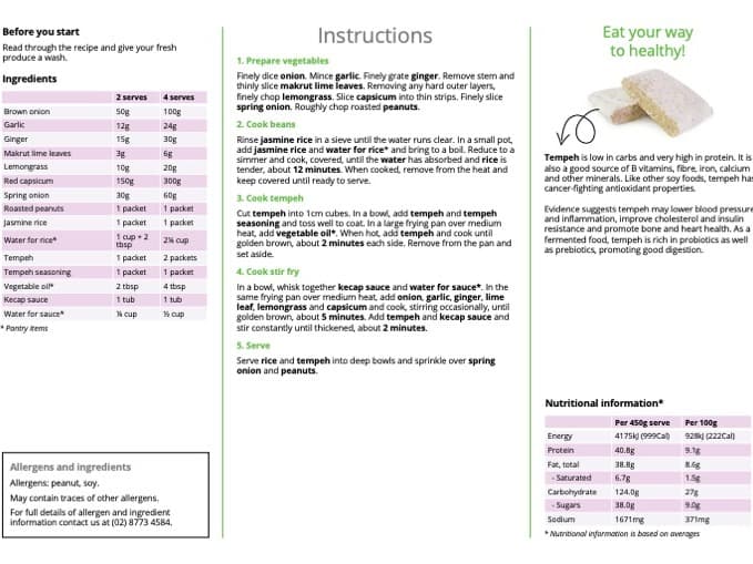 Sweet and sticky housemade kecap sauce coats crispy tempeh and peanuts on a bed of fluffy rice, you'll wonder why you ever ordered takeout! Spiciness mild/optional Pantry items needed: vegetable oil, chilli flakes (optional) Hands-on: 30 mins, ready in: 35 mins Cooking equipment: small pot, large frying pan Use within 5 days of receiving your meal kit.