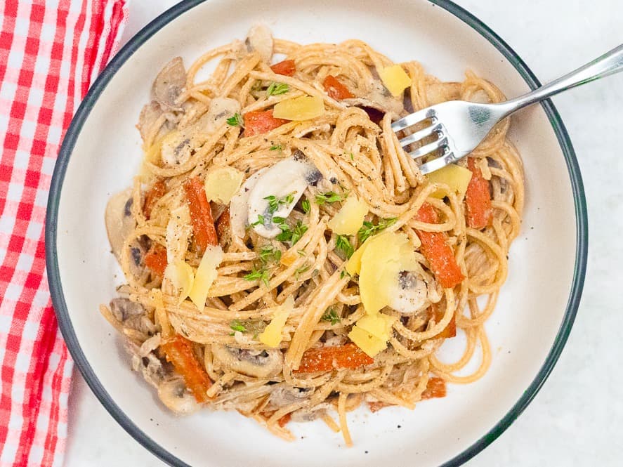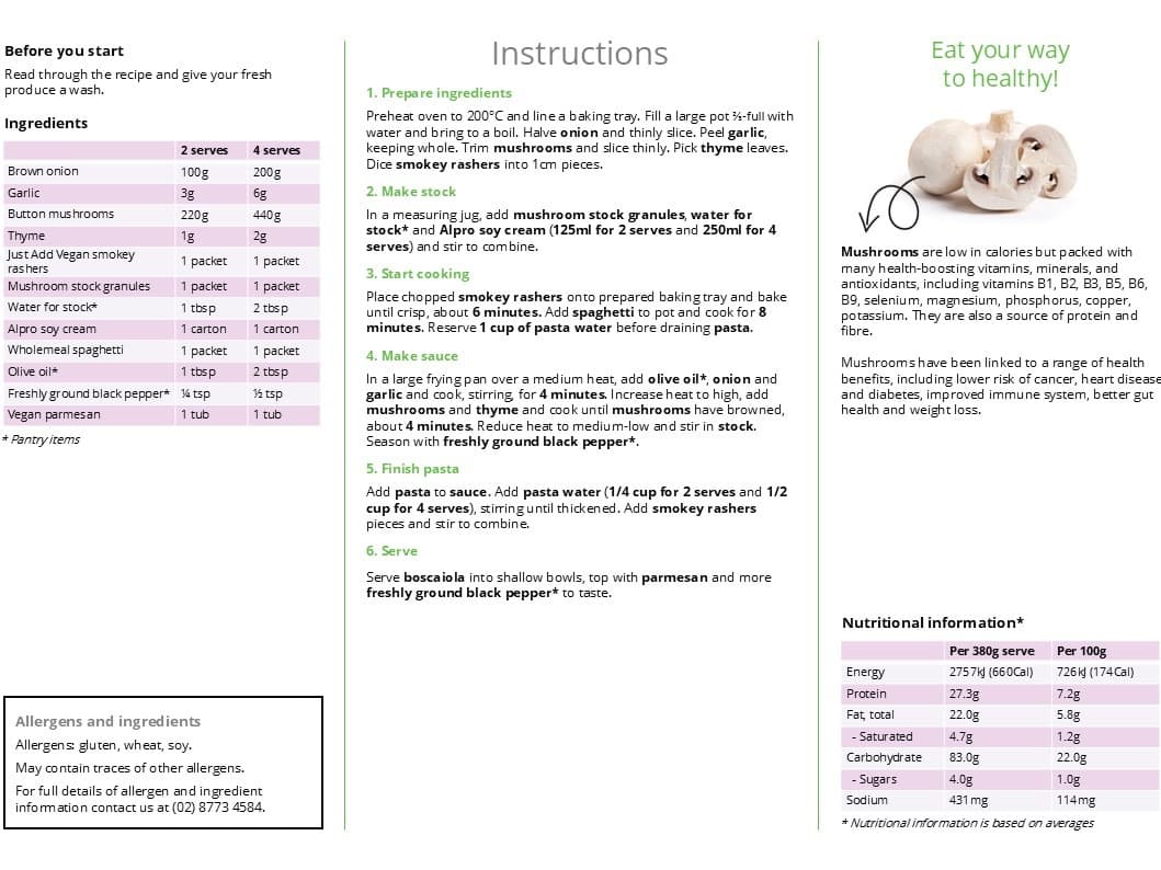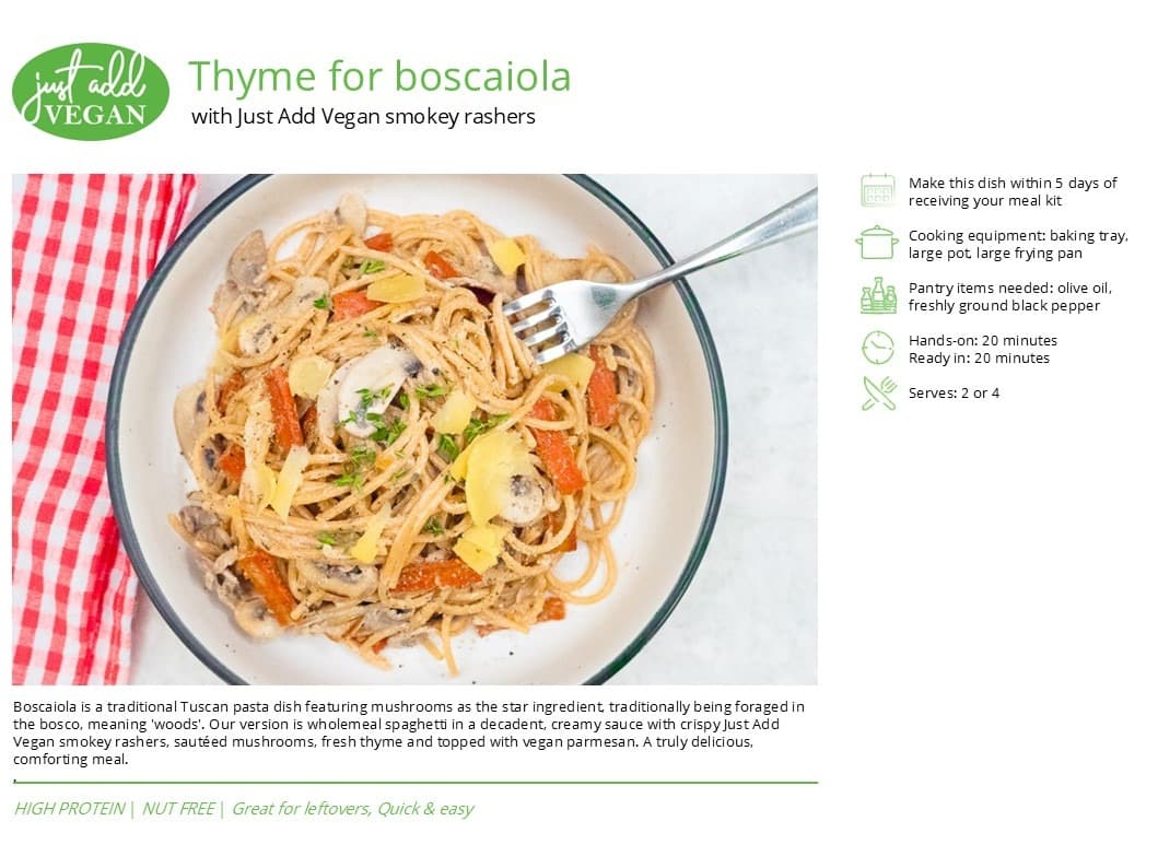 Now with extra smokey rashers! Boscaiola is a traditional Tuscan pasta dish featuring mushrooms as the star ingredient, traditionally being foraged in the bosco, meaning 'woods'. Our version is wholemeal spaghetti in a decadent, creamy sauce with crispy house-made smokey rashers, sautéed mushrooms, fresh thyme and topped with Green Vie parmesan. A truly delicious, comforting meal. Pantry items needed: olive oil, freshly ground black pepper Hands-on: 30 mins, Ready in: 30 mins Cooking equipment: large pot, large frying pan Use within 5 days of receiving your meal kit.