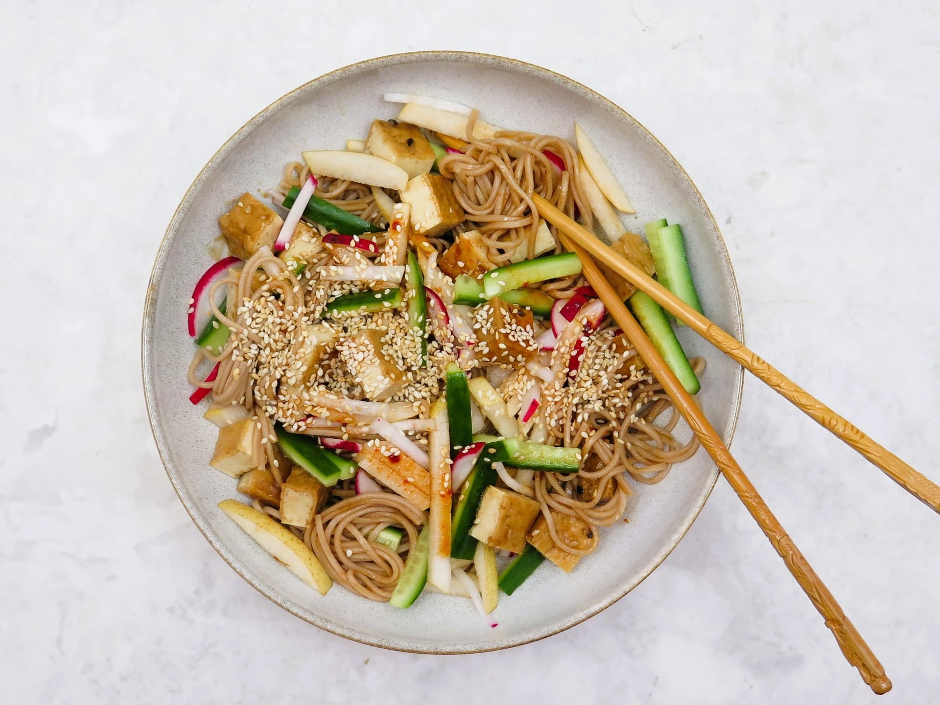 This spicy Korean-inspired noodle salad, using organic soba noodles, is a most fantastic flavoursome dish. Featuring Soyco ready-to-eat Sesame, Soy & Ginger tofu, cucumber and Asian pear in a spicy Korean sauce. The portions are generous so you can save some for lunch the next day! Spiciness mild. Pantry items needed: none Hands-on: 10-15 mins, ready in: 15-20 mins Cooking equipment: large pot Use within 5 days of receiving your meal kit.