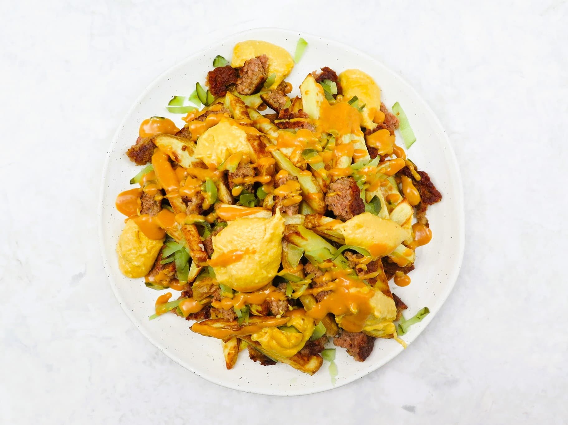 Oven-baked, unskinned potatoes - packed with vitamins, minerals and antioxidants - topped with chunks of Froom mushroom burger, house-made cashew-based cheese sauce, mustardy special burger sauce and zingy pickles. Get ready for an unforgettable flavour experience! Pantry items needed: olive oil, vegetable oil, plant-based milk, salt Hands-on: 25 mins, ready in: 45 mins Cooking equipment: baking tray/s, large frying pan, small pot Use within 5 days of receiving your meal kit.