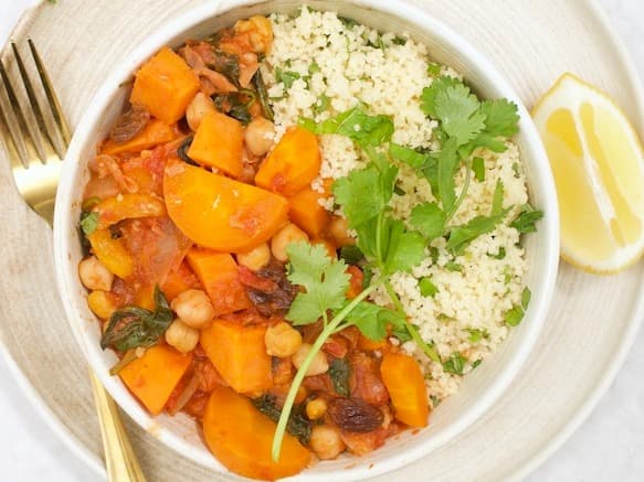 This traditional Moroccan dish is made easy in this recipe. With a colourful assortment of vegetables, chickpeas, sweetness from apricots and sultanas and deep rich spices of the Middle East, it's a great winter warmer. Served on a bed of couscous. Spiciness mild/optional. Pantry items needed: olive oil, chilli flakes (optional), salt Hands on: 15-20 mins; Ready in: 25-30 mins Cooking equipment: large pot Use within 5 days of receiving your meal kit.