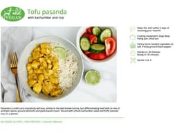 Tofu hi-protein firm (Soy), Water, Plant based cream (Flora), Basmati rice, Brown onion, Tomato, Cucumber, Vegetable oil (pantry item), Almond meal, Garlic, Ginger, Lime juice, Pasanda spice [Cumin ground, Turmeric, Cardamon ground, Coriander ground, Cinnamon ground, Cayenne pepper, Garam masala, Cloves ground], Salt (pantry item), Freshly ground pepper (pantry item)