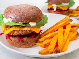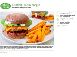 Froom mushroom-based burger patties on Herman Brot lower carb high protein buns with earthy beetroot, crisp cos lettuce, vegan cheddar and house-made truffle aioli and caramelised onion chutney. Served with a side of baked sweet potato fries, You won't want to go out for burgers ever again! Pantry items needed: olive oil, vegetable oil, salt; Hands-on: 20 mins, ready in: 35 mins; Cooking equipment: large baking tray/s; small pot, large frying pan; Use within 5 days of receiving your meal kit.