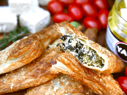 Olive oil, Lemon juice, Puff pastry (Wheat), Tofu (Soy), Rosemary, Sesame seed, Spinach, Apple cider vinegar, Salt, Garlic