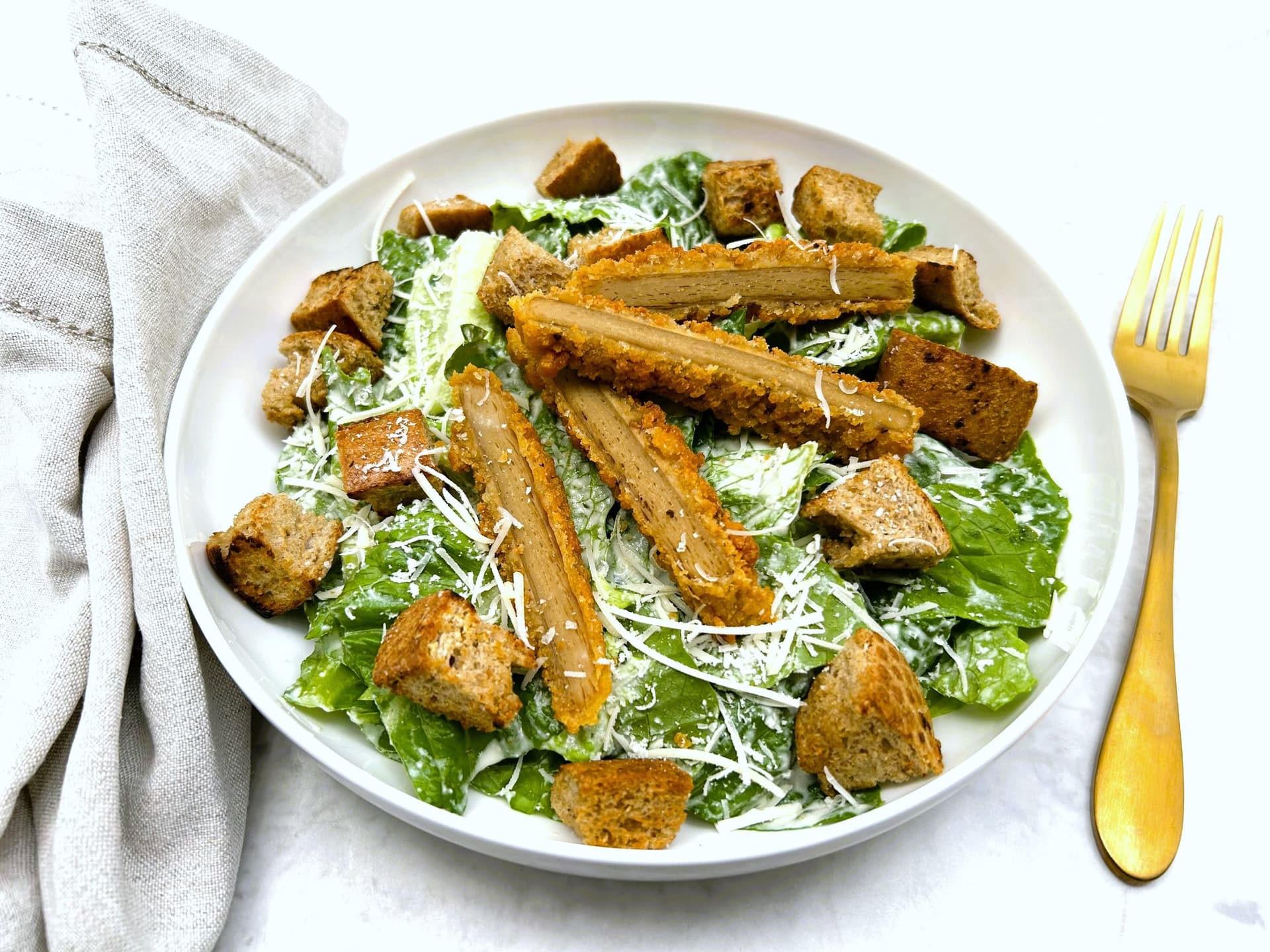 This caesar salad is one of our favourite meals, especially on warm days. Crispy cos lettuce and wholemeal croutons are tossed in our house-made, cashew-based caesar dressing and topped with crispy, succulent strips of Forever plant-based chicken-style schnitzel, finished off with a sprinkle of vegan parmesan. The result is an irresistible symphony of textures and umami-rich flavours. Pantry items needed: vegetable oil Hands-on: 10-15 mins, Ready in: 10-15 mins Cooking equipment: medium/large frying pan Use within 3 days of receiving your meal kit.