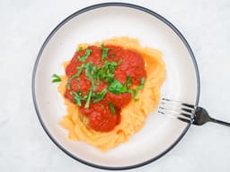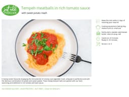 Tomato and basil sauce, Tempeh original (Soy), Potatoes, Sweet potato, Water, Meatball dry mix [Gluten-free breadcrumbs, Nutritional yeast, Garlic powder, Salt, Italian herbs, Fennel seeds, Ground black pepper], Meatball seasoning mix [Tamari (Soy), Miso shiro organic (Soy), Tomato ketchup], Plant-based butter (pantry item), Parsley, Salt (pantry item), Olive oil spray (pantry item)