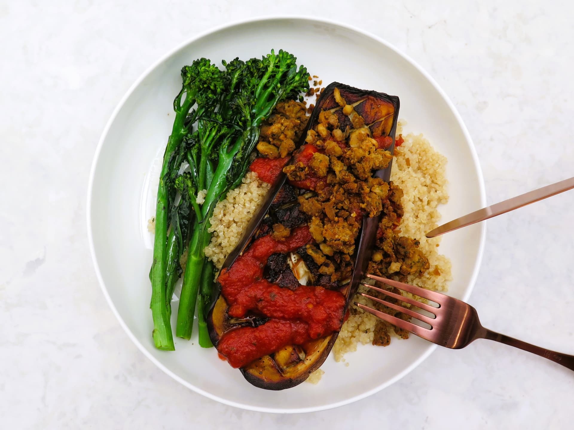 Roasted eggplant and broccolini served over a bed of fluffy quinoa, topped with savoury sausage-style tempeh crumble and a rich tomato and basil sauce. A fuss-free dish that brings together classic Italian flavours in no time at all. Pantry items needed: Extra virgin olive oil, salt, freshly ground black pepper Hands-on: 20 mins, Ready in: 35 mins Cooking equipment: baking tray x 2, small pot Use within 5 days of receiving your meal kit