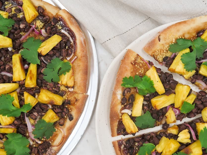 This unusual medley is just the best. Black beans, red onion and fresh pineapple sit on a base of smoky BBQ sauce and housemade cashew parmesan. All with our new pre-made Buvetti sourdough thin crust pizza base, you'll be chuffed with the results and how easy it is to make this dish! Pantry items needed: olive oil; Hands-on: 10 mins, Ready in: 20 mins; Cooking equipment: baking tray/s; Use within 5 days of receiving your meal kit.