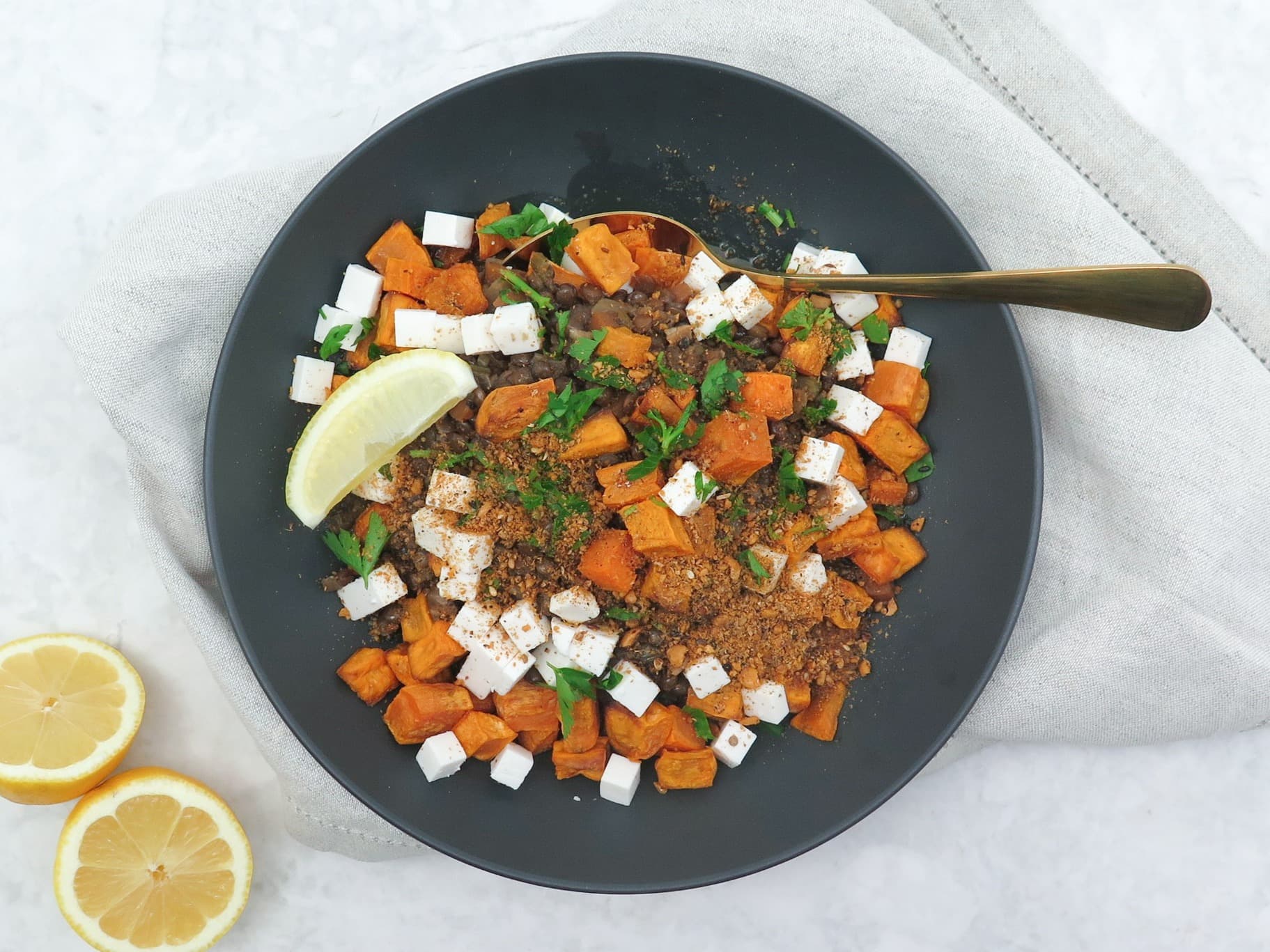 This hearty bowl of braised French lentils will have your taste buds dancing with creamy vegan feta, punchy house-made dukkah and zesty lemon! Roasted sweet potato is the ultimate companion for this French comfort dish. Pantry items needed: olive oil; Hands-on: 20 mins; Ready in: 45 mins; Cooking equipment: baking tray, medium/large pot; Use within 5 days of receiving your meal kit.